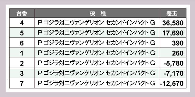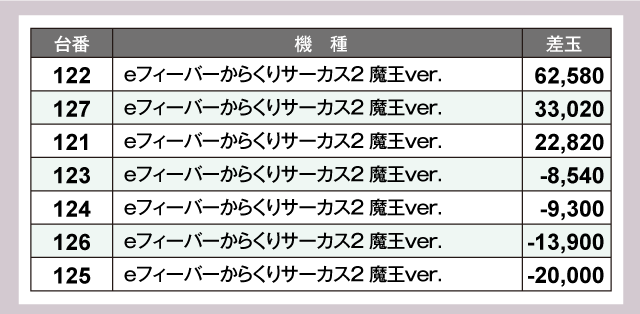 一方、パチンコで最も目立っていたのが『eフィーバーからくりサーカス2 魔王ver.』で、122番台の+62,580発を筆頭に+33,020発に+22,820発と、驚異的な記録が連発しているだけにシマ内は常に活気に満ち溢れていた。