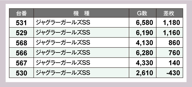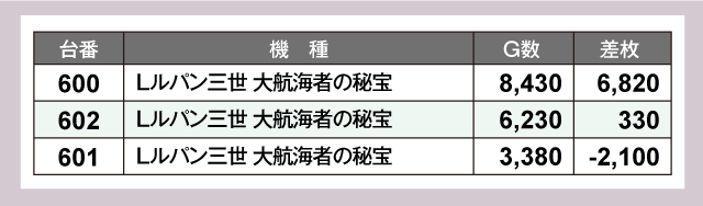 まずはパチスロをチェック。『Lルパン三世 大航海者の秘宝』と『パチスロ からくりサーカス』からそれぞれ+6,000枚超が発生、さらに『ジャグラーガールズSS』はプラス差枚で終了している台を多数確認している。
