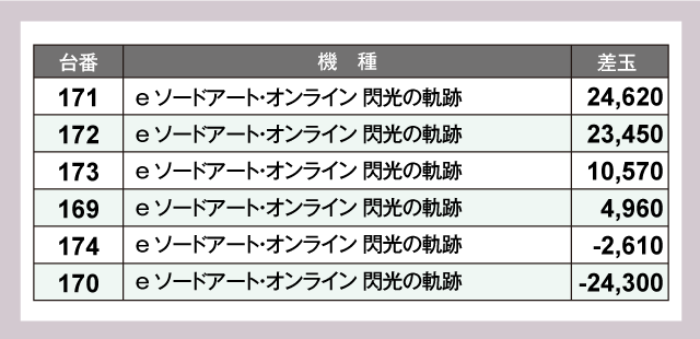 一方のパチンコは『e ソードアート・オンライン 閃光の軌跡』から+20,000発超が2台、『eフィーバーからくりサーカス2 魔王ver.』からは+40,000発が2台と、ハイレベルな記録が複数出現しておりシマ内は常に活気に包まれていた。