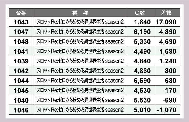 なかでもプレイヤーの注目を集めたのが『スロット Re:ゼロから始める異世界生活 season2』で、1043番台が圧巻の+17,090枚を叩き出している上に、全10台中7台がプラス差枚で終了する大盤振る舞いであった。