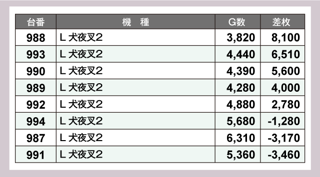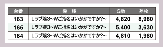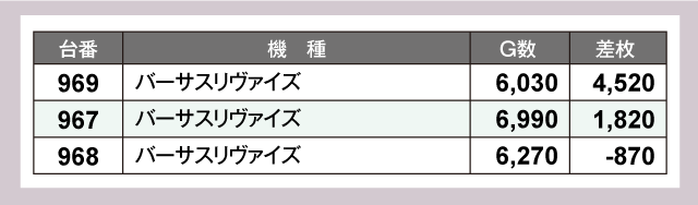 また、その他の機種を見てみると『L 犬夜叉2』と『Lラブ嬢3〜Wご指名はいかがですか?〜』から+8,000枚超が出現。さらにスマスロ以外では『バーサスリヴァイズ』が奮闘しており969番台が+4,000枚超を記録している。