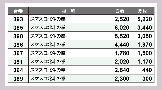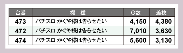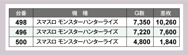 まず、パチスロで注目となったのが『スマスロ モンスターハンターライズ』で、498番台が万枚超の+10,260枚を記録。また、『スマスロ北斗の拳』からは393番台の+5,220枚をはじめ+3,000枚超が2台、『パチスロ かぐや様は告らせたい』は全台がプラス差枚で終了するという見事な結果を残している。