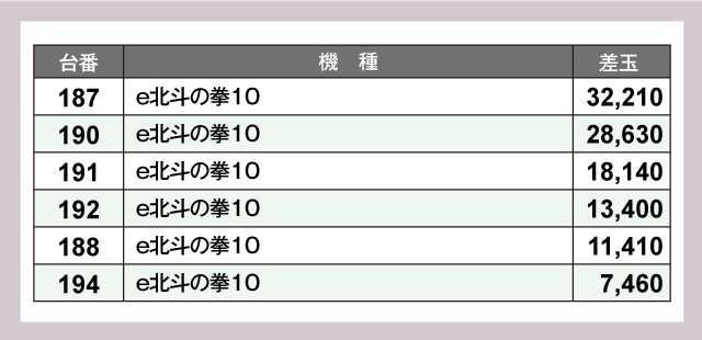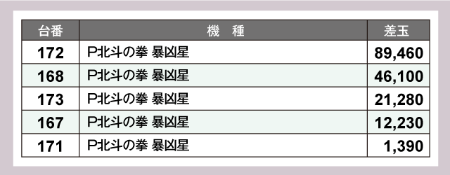一方のパチンコは、北斗の拳シリーズが盛り上がりを見せており『P北斗の拳 暴凶星』で圧巻の+89,460発、さらに『e北斗の拳10』からは187番台の+32,210発を筆頭に万発超が大量発生しており、両シマは常に活気に満ち溢れていた。
