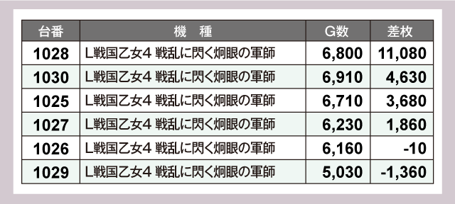 なかでもプレイヤーの注目を集めたのが『パチスロ からくりサーカス』で、86番台の+8,140枚を皮切りに+7,000枚超を2台確認。さらに、『L戦国乙女4 戦乱に閃く炯眼の軍師』からは万枚超の+11,080枚が発生している。