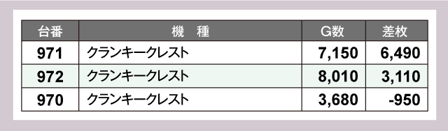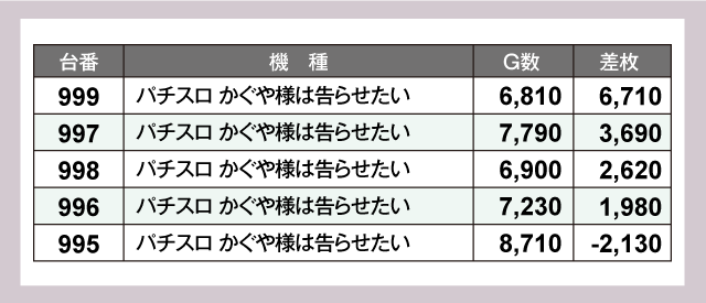 次に、その他の機種を見てみると『パチスロ かぐや様は告らせたい』は+6,000枚超を筆頭に全5台中4台がプラス差枚で終了。また、『クランキークレスト』から+6,000枚超、『スマスロバジリスク~甲賀忍法帖~絆2 天膳 BLACK EDITION』から+5,000枚超といった好成績が飛び出しファンを喜ばせていた。