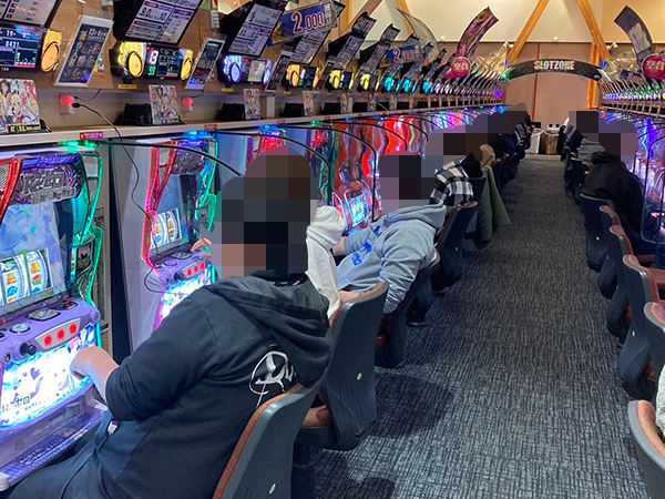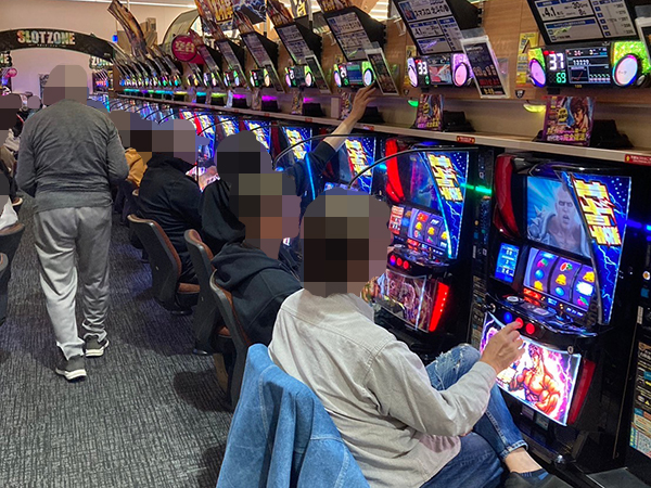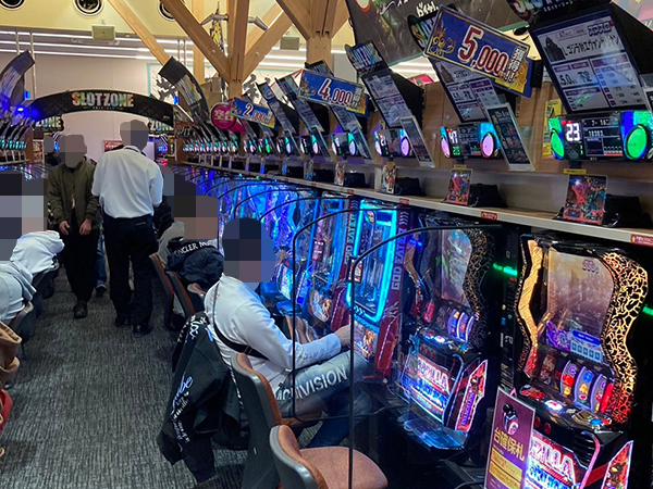 取材時は多くのプレイヤーが来店。パチンコ・パチスロともに、様々な機種が支持を得ていた。