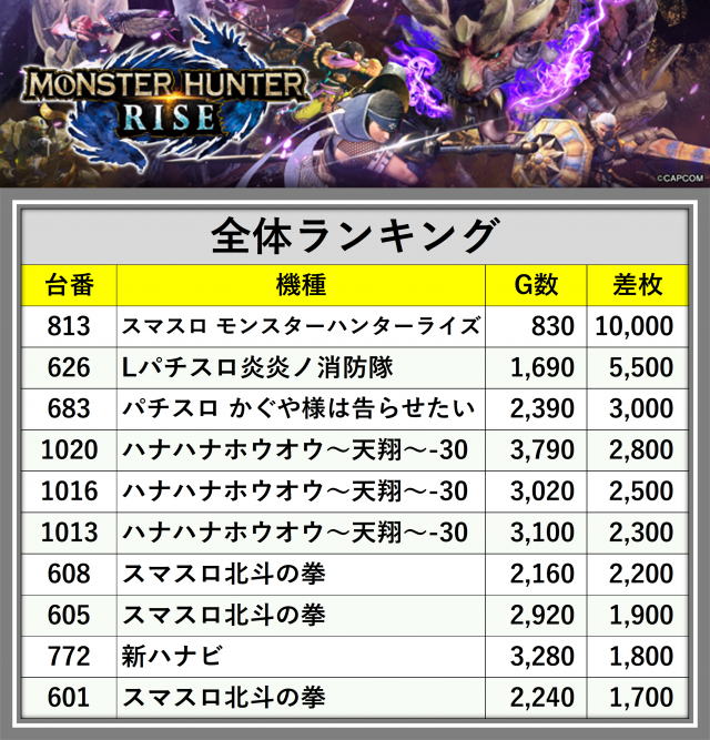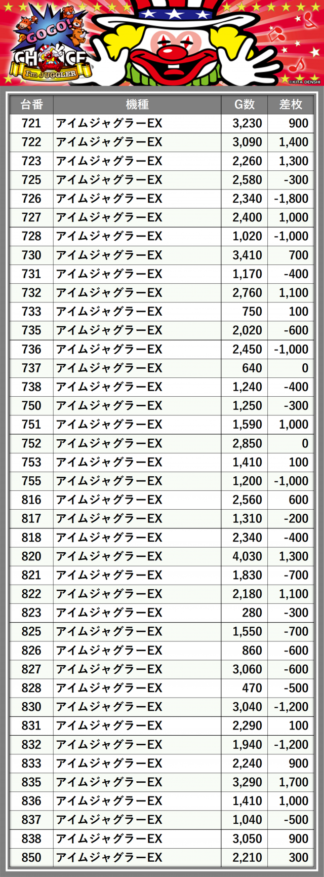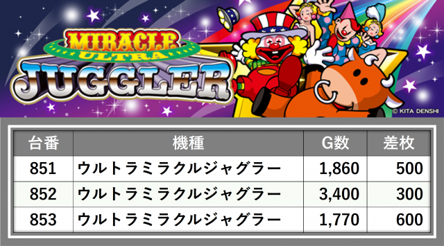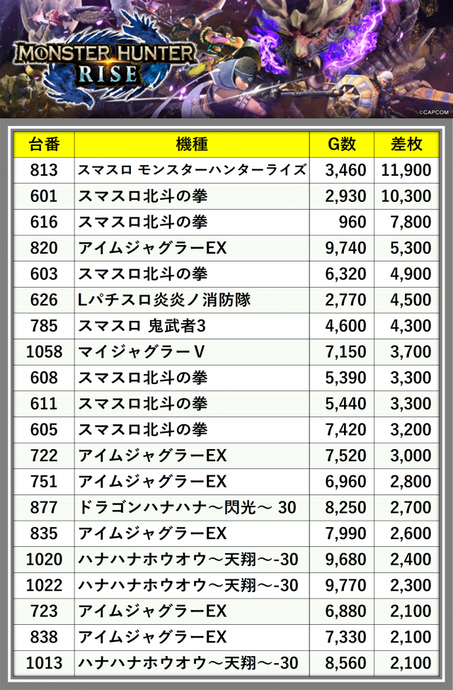 厳選された取材対象機種をはじめ、その他スロット全体から好記録が飛び出した!プレイヤーが楽しんだ1日を下記データにて振り返ってみて欲しい。