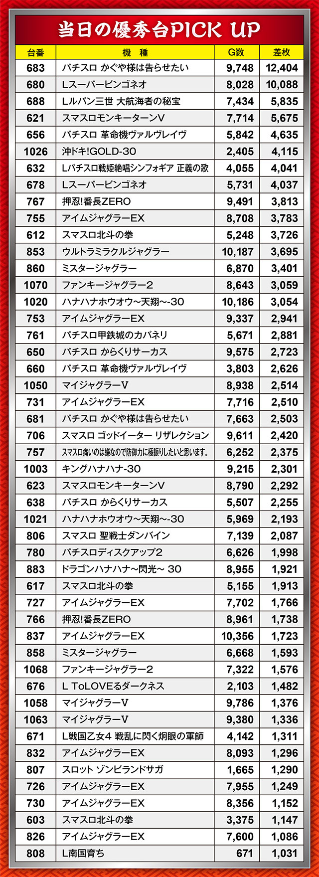 今回は10,000枚オーバー台が2台!これまでと比べても明らかに強めな結果だったように思う。またこれまで同様、『ジャグ』シリーズの活発な動きに加え、新台からも元気な結果が生まれていた。それすなわち今回もパチスロコーナー全域にチャンスが潜んでいたことの証明!
