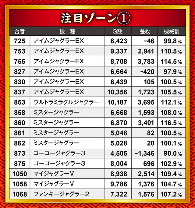 この日も『ジャグラー』シリーズから多くのプラス結果が生まれた。どの『ジャグ』からも満遍なくプラス差枚が出現していたが、やはり設置台数の多い『アイムジャグラーEX』にその傾向が強く見られた様子。