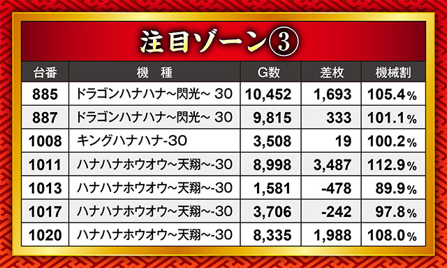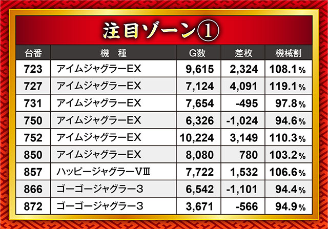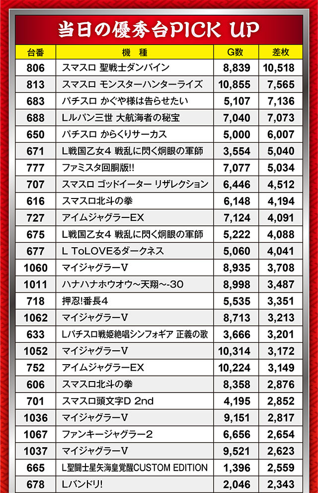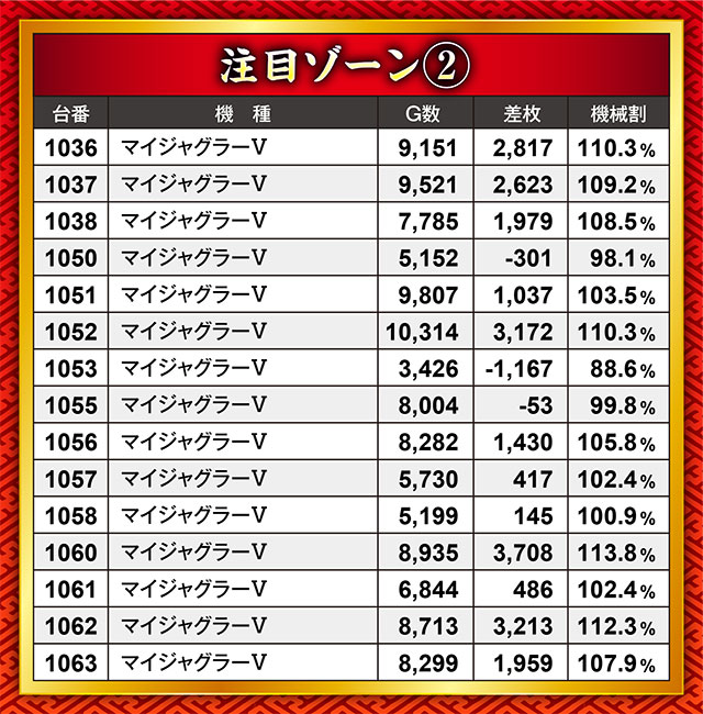 シリーズの中で最も勢いづいていたのが『マイジャグラーⅤ』。2,000枚オーバー記録のみならず、3,000枚を上回る結果も複数台誕生。今回は『マイジャグ』に優秀台が多く潜んでいた…!?