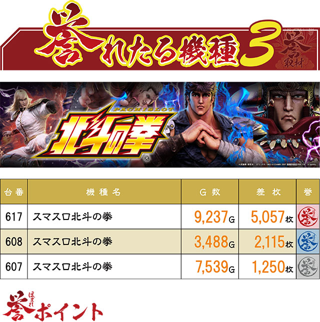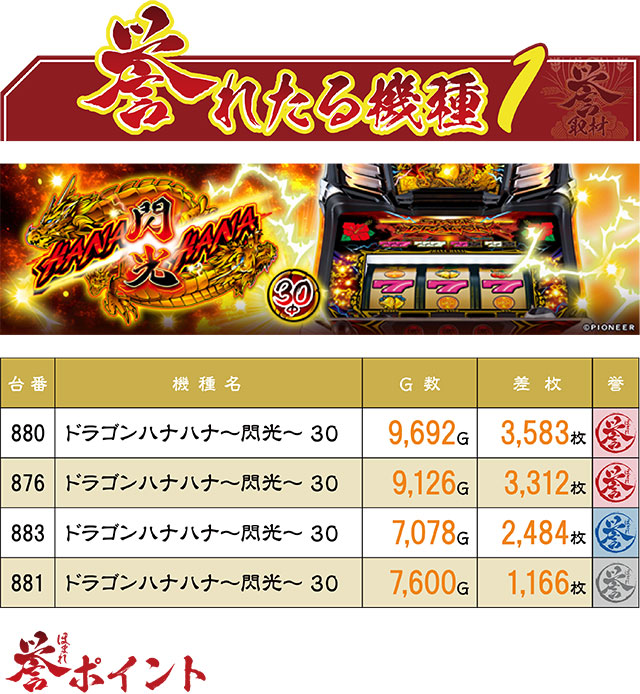 誉ランキングに沖スロが複数ランクインするのは、このお店のお約束。今回は『ドラゴンハナハナ~閃光~ 30』から4台の誉レコードが誕生した。特に赤誉マーク(=3,000枚以上)の2台の光りっぷりは見事で、打っていた方も優秀台を確信していたのではないだろうか。