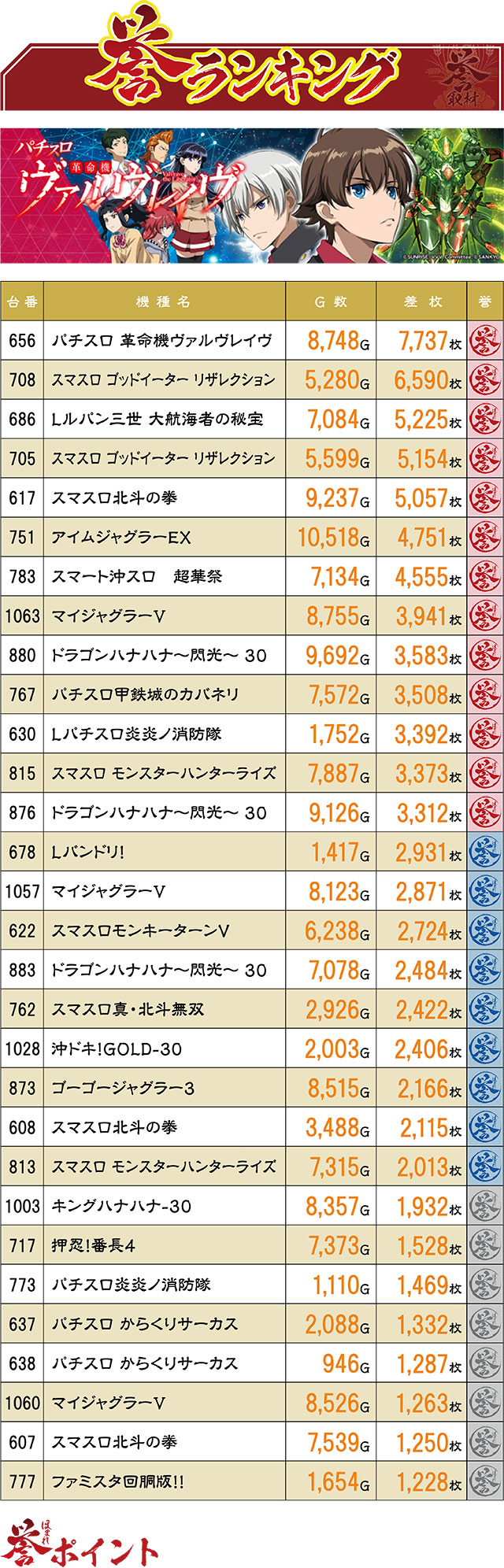 7,000枚を優に上回る結果で、この日の差枚1位記録となったのは『パチスロ 革命機ヴァルヴレイヴ』の656番台。3位には新台導入ほやほやの『Lルパン三世 大航海者の秘宝』が颯爽とランクインを果たした。さらに7位には1台機種の『スマート沖スロ 超華祭』が入賞するなど、バラエティー島にもしっかりチャンスが潜んでいたと見て間違いなさそうだ。