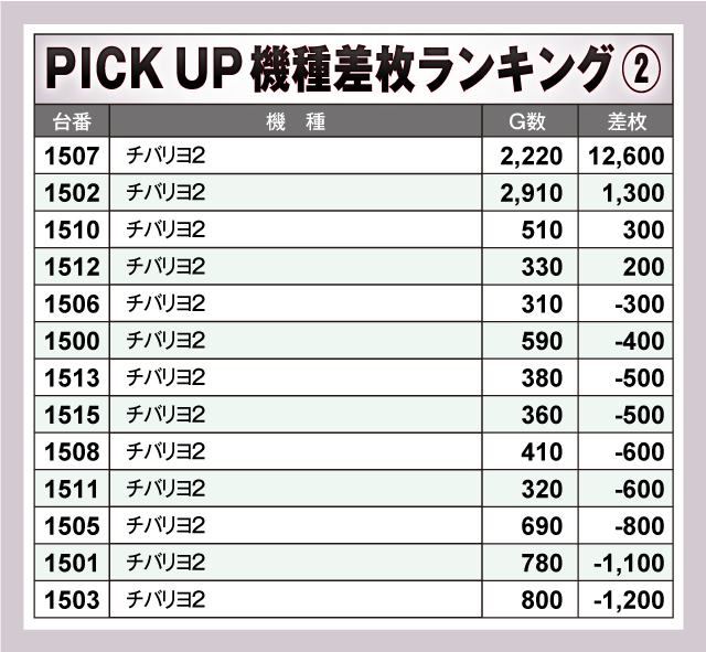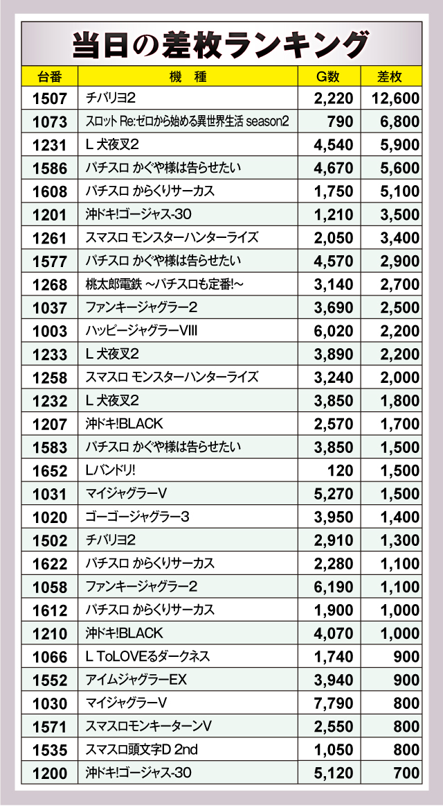 まずは差枚ランキング30台のチェックから。30台のうち24台が+1,000枚オーバーを記録し、+3,000枚オーバーは13台出現! それらのなかでもっとも優秀だったのは、1507番台の「チバリヨ2」で、差枚は大台突破の+12,600枚と素晴らしい記録をマーク! その他ランクイン機種には、人気スマスロ機種や最新機種、ジャグラーシリーズなど店内のあらゆる機種にチャンスがあったようだ!
