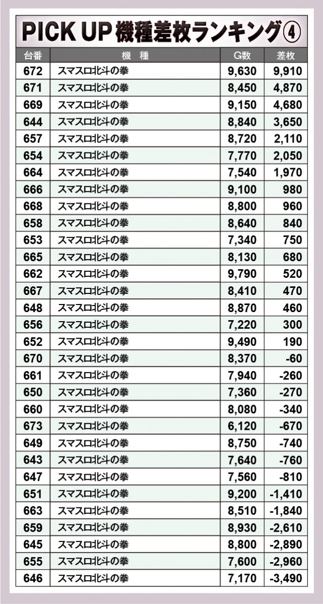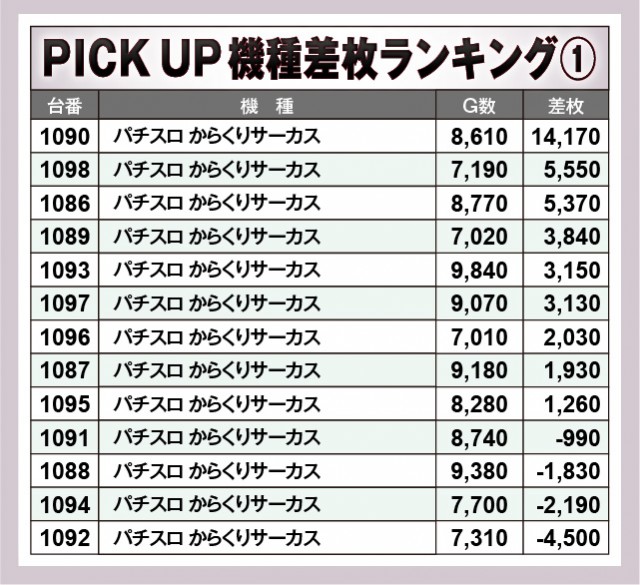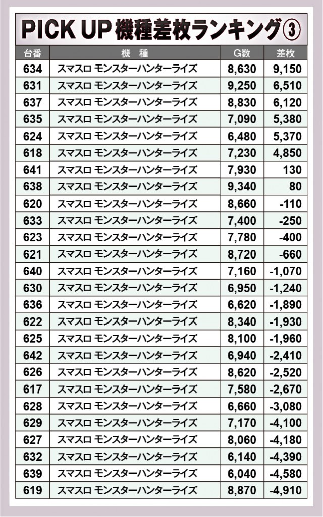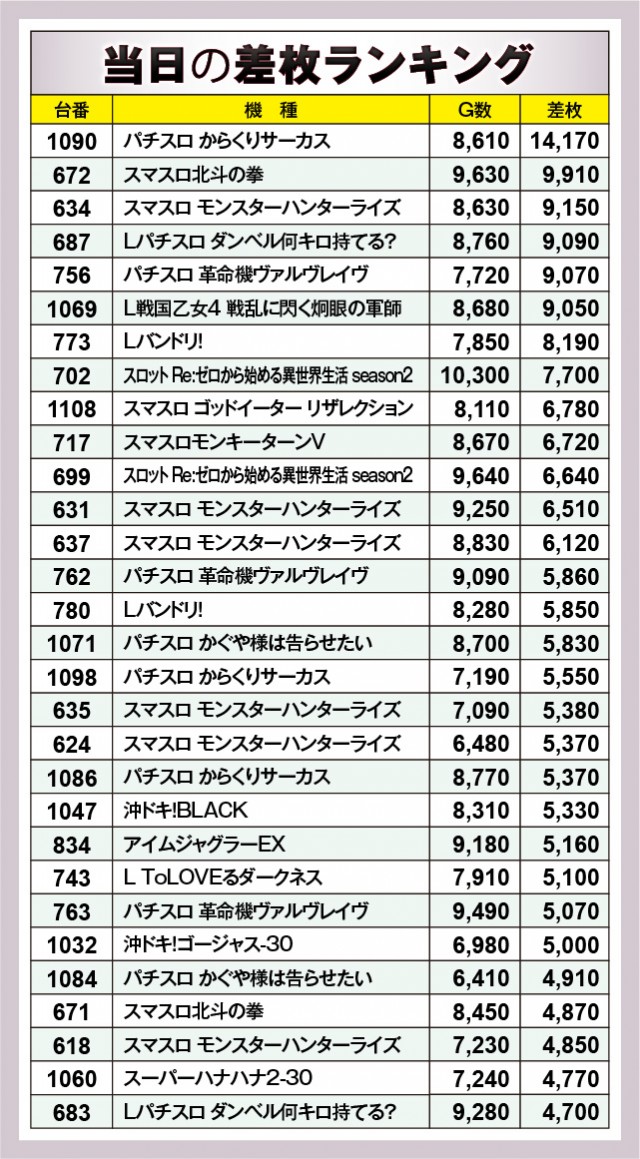 優秀機種=当日のTOP30台と言っても過言ではない内容で、いずれも高い活気と熱気を披露しているのが印象的だ。万枚OVERを達成した『パチスロ からくりサーカス』はまとまった出玉を確保しており、『Lパチスロ ダンベル何キロ持てる?』『スマスロ モンスターハンターライズ』『スマスロ北斗の拳』も同様と言える。いずれの台も高いポテンシャルを秘めており、ファンはレバーオンに力が入っていったはずだ。