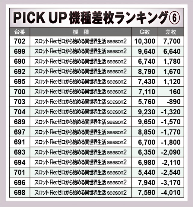 『パチスロ からくりサーカス』にて万枚OVERが生まれており、さらに『スマスロ北斗の拳』『スマスロ モンスターハンターライズ』などが9,000枚OVERで追随している。もちろん回転数に関しても、『スロット Re:ゼロから始める異世界生活 season2』の万回転OVERだけでなく、ほとんどの台が終日を通して打ち込まれていた。何よりも鮮烈なのは、この上位30台は4,000枚OVERからとなっている点で、店内の凄まじい熱量が窺えるばかりだ。