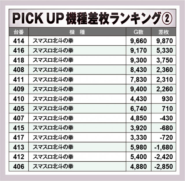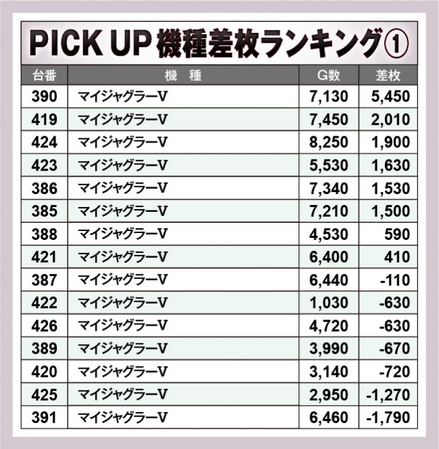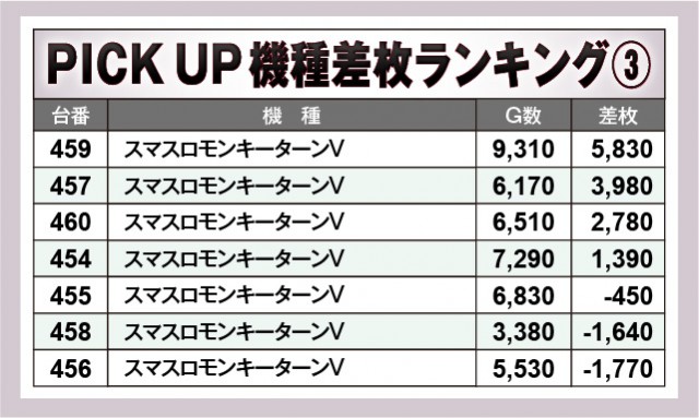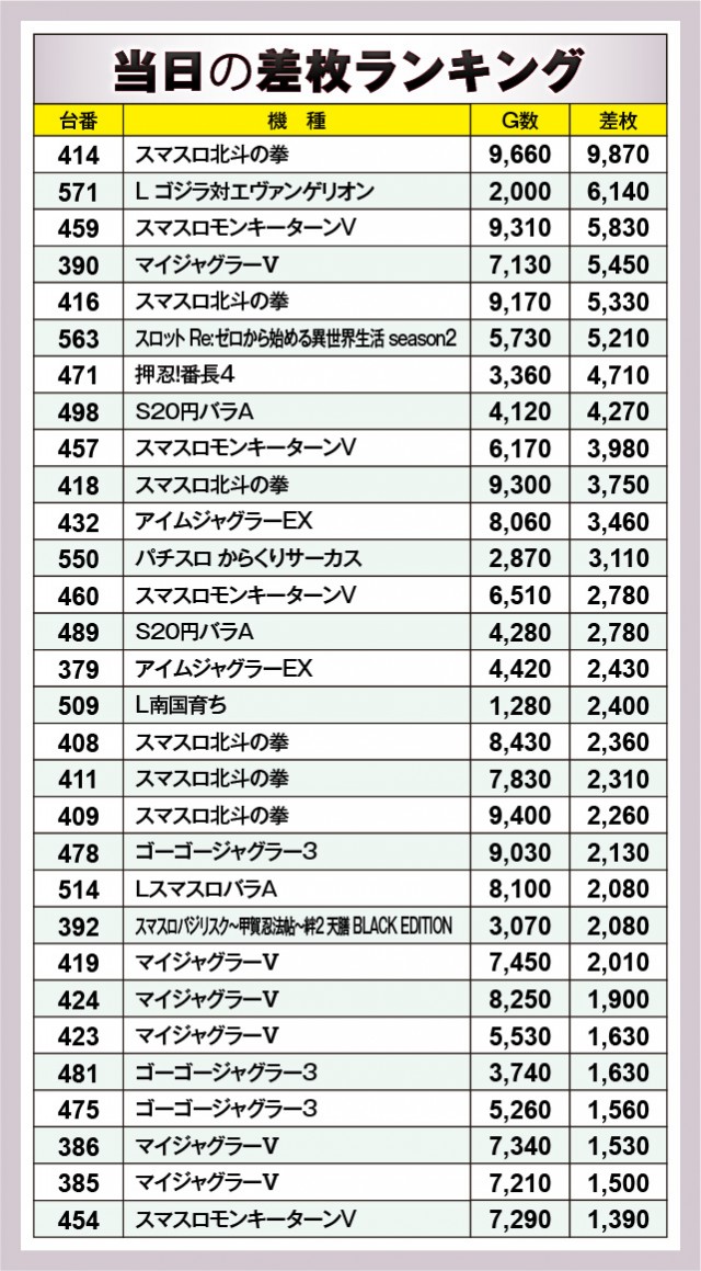 『スマスロ北斗の拳』にて9,870枚と万枚に近づく凄まじい熱量を披露。『L ゴジラ対エヴァンゲリオン』も6,000枚OVERと追随しており、館内の盛り上がりを窺える内容となっている。そして『ジャグラー』シリーズの奮闘も目に焼きつく部分で、上表に名を連ねたいずれもが回転数と差枚数が比例する展開を見せていた。高い活気は閉店まで衰える気配がなく、ファンが有意義な時間を過ごしていたのは確かだ。
