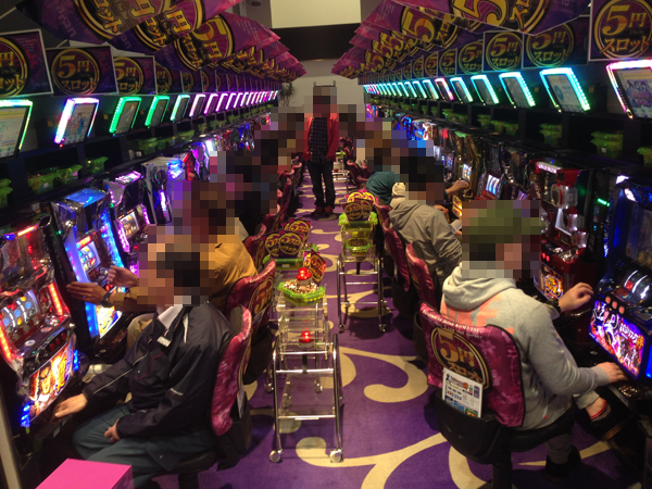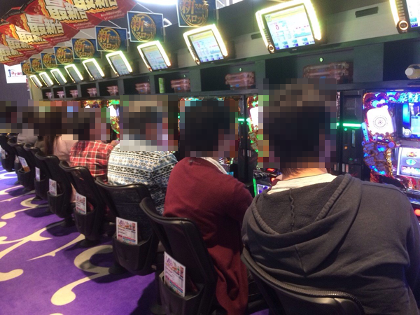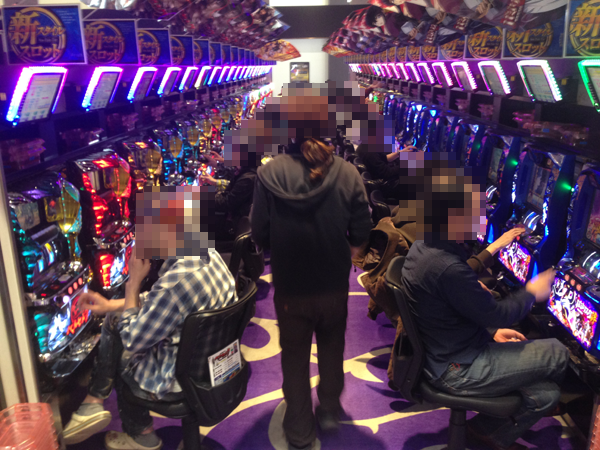 14時を過ぎても20円パチスロで朝から人気だった「麻雀物語3 役満乱舞の究極大戦」と「バジリスク~甲賀忍法帖~絆」は満席のまま。「パチスロベルセルク」や「アナザーゴッドハーデス」、「押忍!サラリーマン番長」といった機種にも空き台はほとんどなくなっていた。