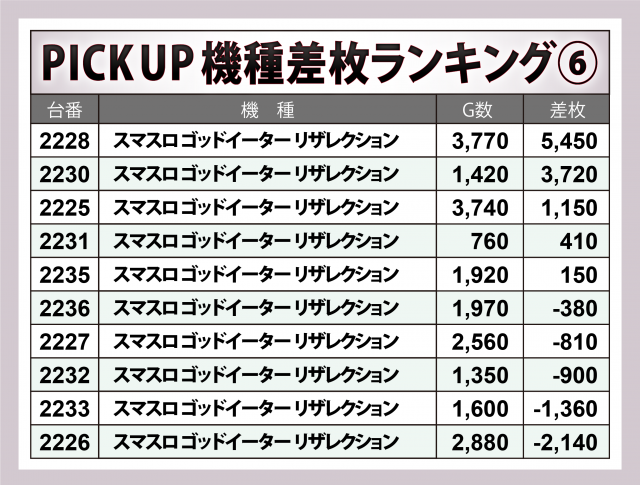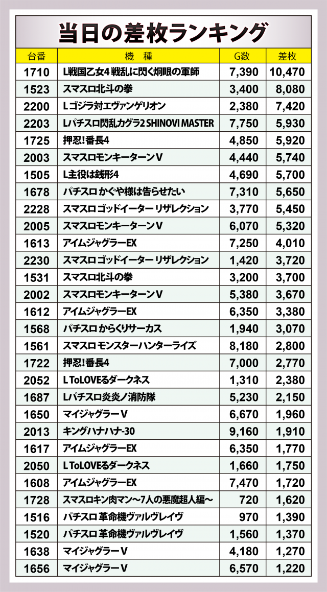 次項で記す6機種以外の好成績としては、『スマスロ北斗の拳』に+8,100枚弱・+3,700枚超が1台ずつ、『L ゴジラ対エヴァンゲリオン』に+7,400枚超、『Lパチスロ閃乱カグラ2 SHINOVI MASTER』『押忍!番長4』が共に+5,900枚超、『L主役は銭形4』に+5,700枚超と、スマスロ各種が潜在能力を開花させた。