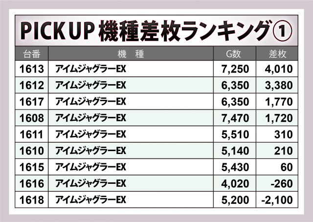 まずは優秀30台の数値から。30台の全てが4桁プラスに成功し、+2,000枚以上は全体の3分の2となる20台、+3,000枚以上は全体の半数強となる16台、+4,000枚以上は11台、+5,000枚オーバーは10台、+7,000枚オーバーは3台、+8,000枚オーバーは2台、そして万枚をクリアしたのが1台と、上々のスタートを切ることができたと言えよう。
