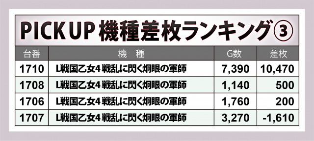 全211台の王座に君臨する+11,500枚弱を叩き出したのが『L戦国乙女4 戦乱に閃く炯眼の軍師』1710番台。加えて、『スマスロ ゴッドイーター リザレクション』では+5,500枚弱・+3,700枚超が1台ずつ、『アイムジャグラーEX』では+4,000枚超・+3,400枚弱が1台ずつと、勝負に値する機種が複数見受けられた。