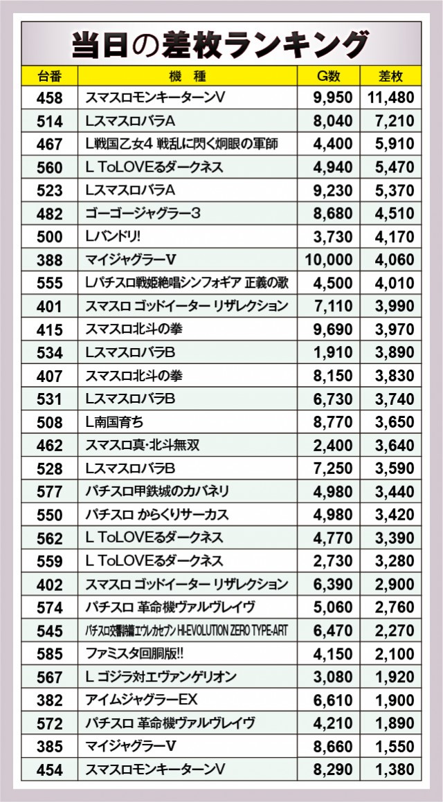 『スマスロモンキーターンV』にて万枚OVERが生まれ、さらにまとまった出玉を確保する台が多く見られるなど、店内を包んでいた熱気の高さを窺える内容となっている。その裏にはファンが競い合うようにレバーを叩いていた活気の高さがあり、『マイジャグラーⅤ』の万回転OVER以外にも8~9,000回転台をマークする台が多発した事実があった。気持ち良くレバーオンができたと言い換えることもでき、ファンの満足度が見て取れるばかりだ。