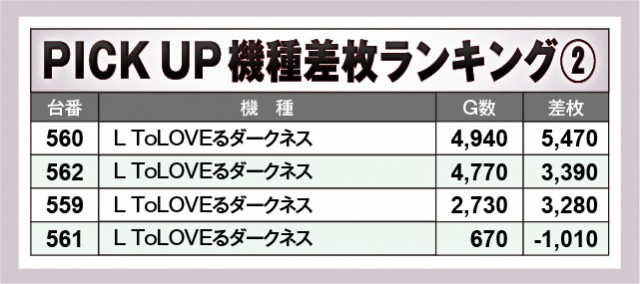 『スマスロ ゴッドイーター リザレクション』は活気と熱気を放ち、店内の盛り上がりに貢献した優秀機種となっている。『L ToLOVEるダークネス』も同様で、こちらでは5,000枚OVERの熱量が見られるなど、遊技するファンを高揚させていた。両機種とも手応えを感じられる状況だったのは確かで、時間の許す限りレバーを叩いていたことだろう。