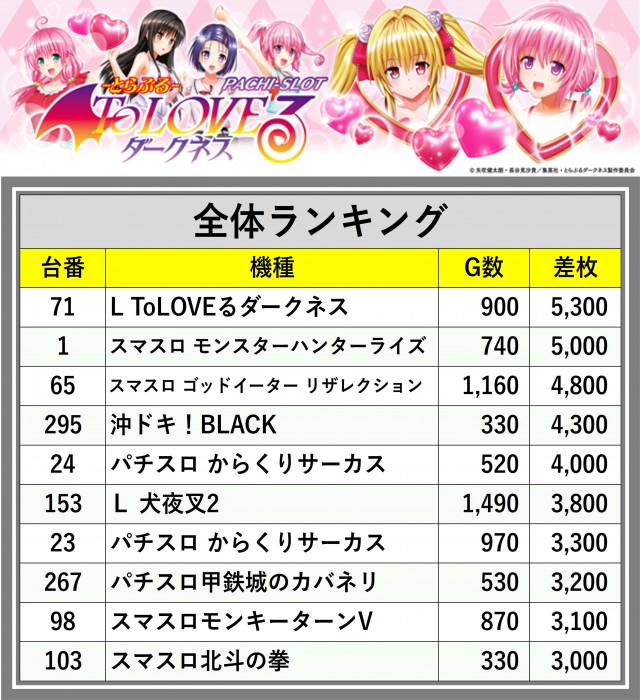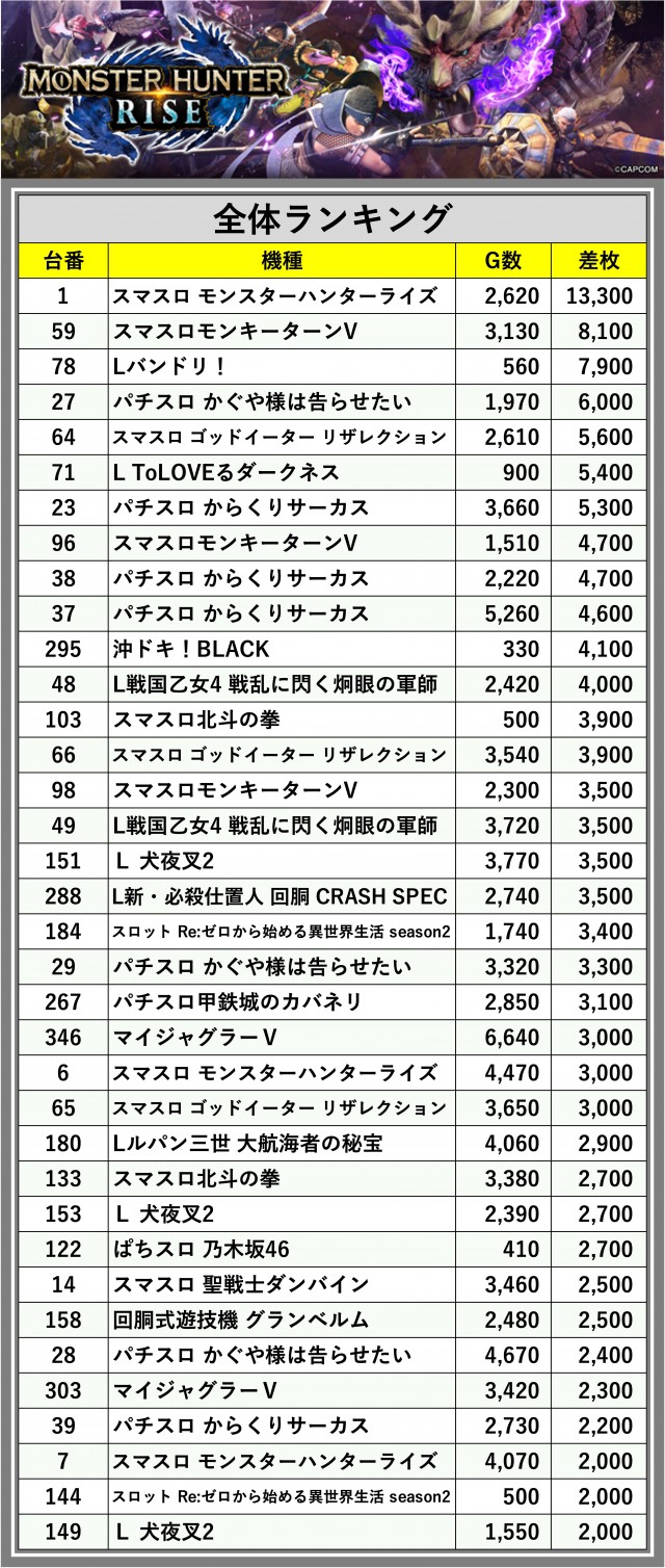 厳選された取材対象機種をはじめ、その他スロット全体から好記録が飛び出した!プレイヤーが楽しんだ1日を下記データにて振り返ってみて欲しい。