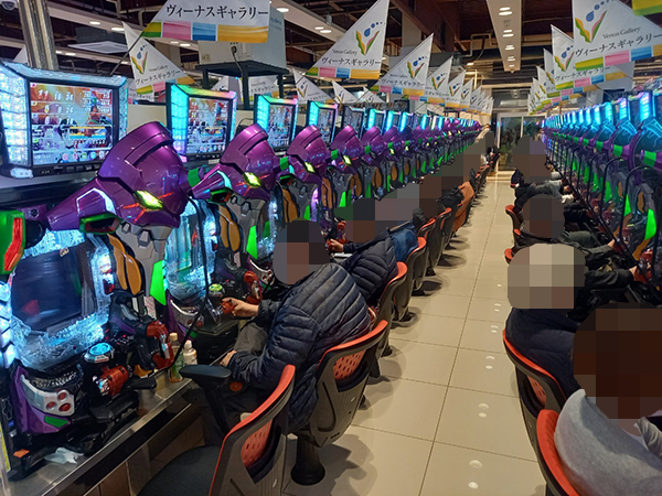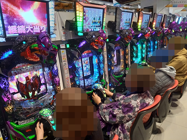 17時ごろの4円パチンコを見てみると「P ゴジラ対エヴァンゲリオン セカンドインパクト G」や「新世紀エヴァンゲリオン〜未来への咆哮〜」が活況。プレイヤーの満足そうな表情から、充実した時間を過ごしていたことがうかがえる。