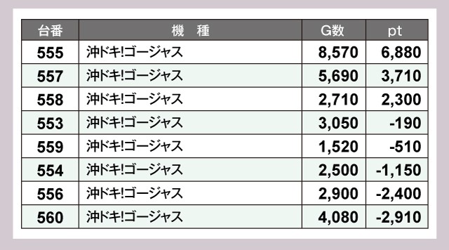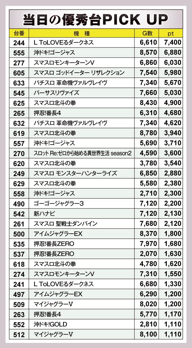 今回は+5,000ptオーバーの好調台が続出。244番台『L ToLOVEるダークネス』をはじめ、555番台『沖ドキ!ゴージャス』、277番台『スマスロモンキーターンV』などあらゆる機種で活気あふれる光景を確認できた。