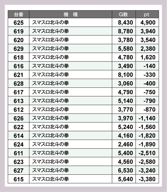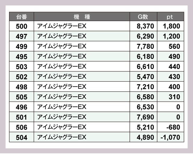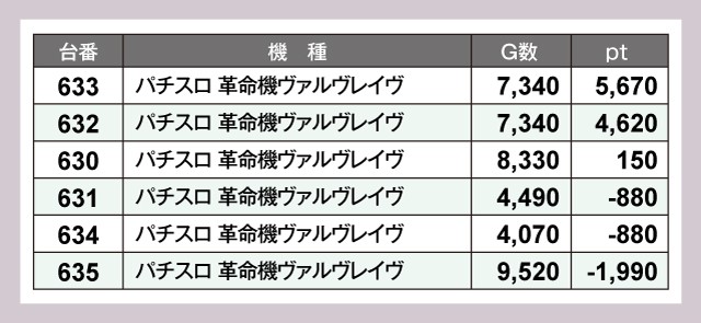 『パチスロ 革命機ヴァルヴレイヴ』は2台がランクイン。633番台が+5,670pt、632番台が+4,620ptと素晴らしい記録を残している。