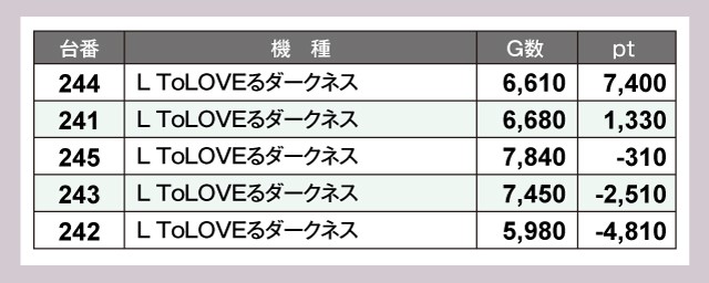 『L ToLOVEるダークネス』では、244番台が+7,400ptと圧巻のパフォーマンスでランキング1位に輝いた。