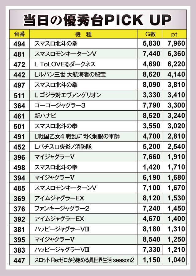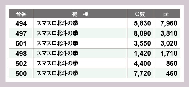 この日は494番台、481番台、472番台が+5,000ptオーバーを達成!なかでも『スマスロ北斗の拳』は+7,960ptと素晴らしい結果を残している。