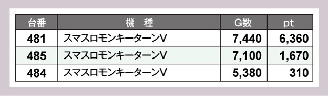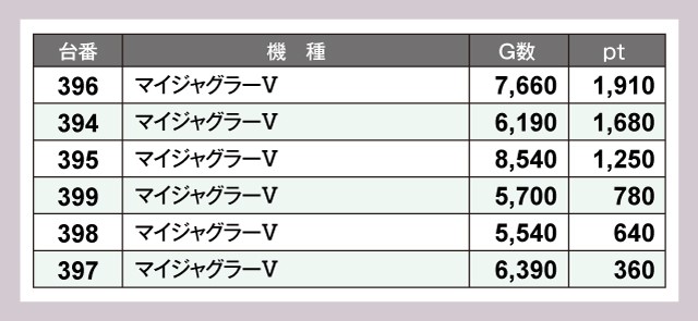 さらに『スマスロモンキーターンV』は381番台が+6,360ptと絶好調。『マイジャグラーⅤ』も+1,000ptオーバーの台が複数見られ、多くのファンを楽しませていた。