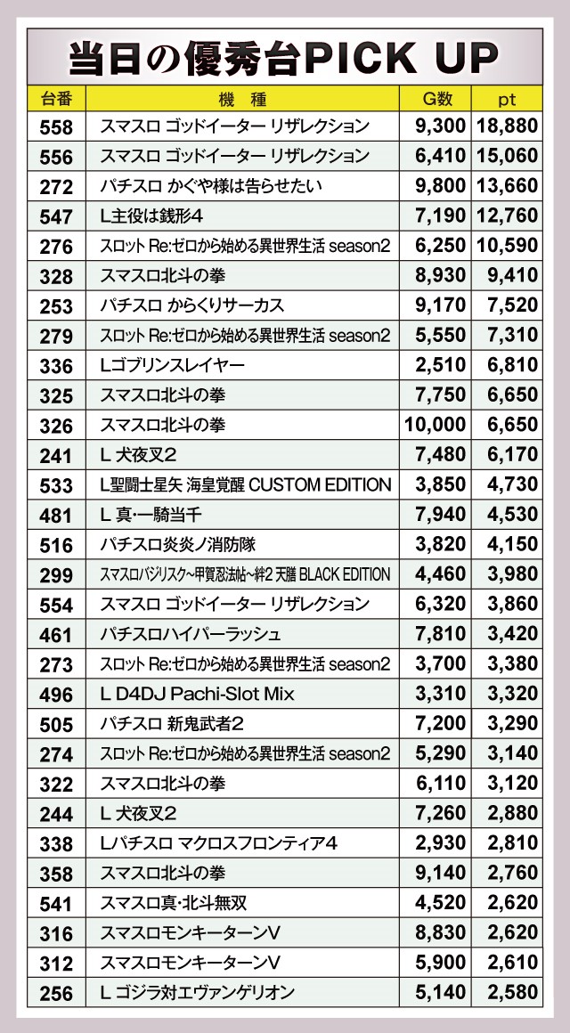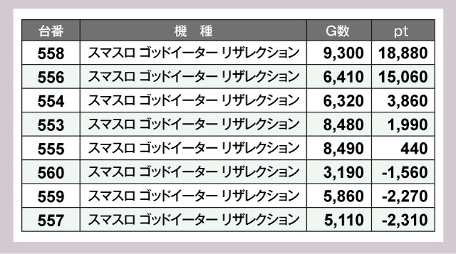 『スマスロ ゴッドイーター リザレクション』は558番台+18,880pt、556番台+15,060ptと圧巻のパフォーマンスを披露していた。