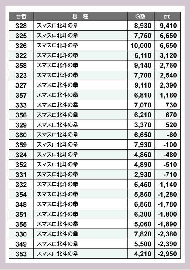 また『スマスロ北斗の拳』は結果に波はあるものの328番台の+9,410ptをはじめ、+6,000ptオーバーが複数誕生していた。