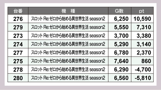 『スロット Re:ゼロから始める異世界生活 season2』は276番台が+10,590ptと活躍するほか、+2,000pt超も多数見られた。