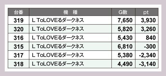 『L ToLOVEるダークネス』や『スマスロモンキーターンV』も活況の様子。+3,000pt、+4,000ptの好調台があちこちで誕生していた。