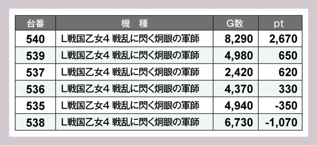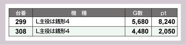 『L主役は銭形4』は2台揃って絶好調。299番台は+8,240ptとポテンシャルを最大限に発揮している。