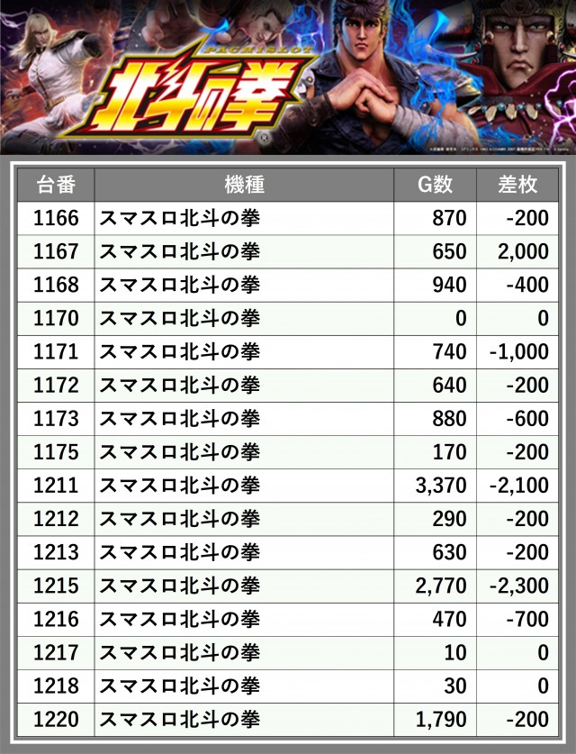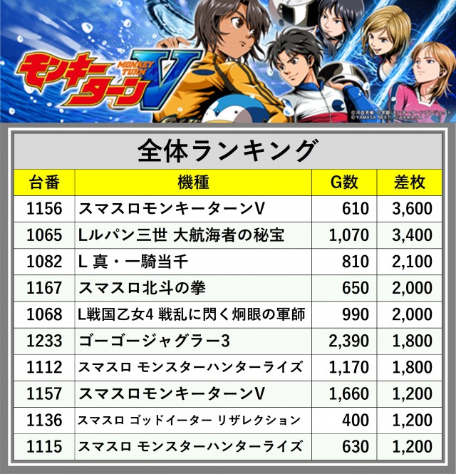 厳選された取材対象機種をはじめ、その他スロット全体から好記録が飛び出した!プレイヤーが楽しんだ1日を下記データにて振り返ってみて欲しい。