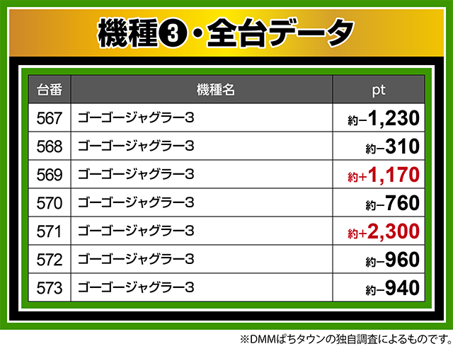 『ゴーゴージャグラー3』も569番台が約+1,100ptオーバー。