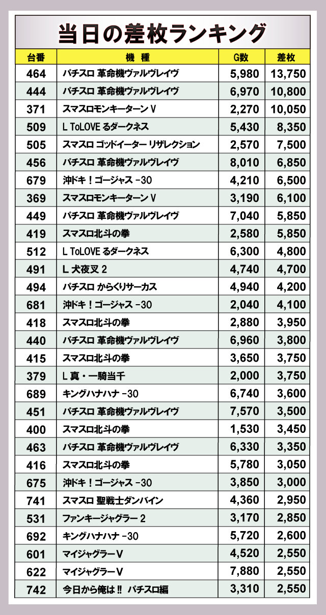 『パチスロ 革命機ヴァルヴレイヴ』『スマスロモンキーターンV』の3台から万枚OVERが飛び出し、さらに『L ToLOVEるダークネス』が+8,000枚OVERと追随。店内は熱気に包まれていたと言えるだろう。また、新台『沖ドキ!ゴージャス-30』『L 犬夜叉2』『スマスロ 聖戦士ダンバイン』もさっそく名を連ねており、今後の活躍が期待されるばかりだ。