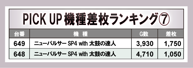 さらに、特に盛り上がりを見せていた機種に注目してみると『スマスロ北斗の拳』からコンスタントな大当りを確認でき、人気機種としてファンを興奮させる状況になっていたようだ。さらに『ニューパルサーSP4 with 太鼓の達人』では全台プラス差枚数を達成。他にも大台突破台を確認でき、優秀機種から盛り上がりが発生していた様子が窺える。