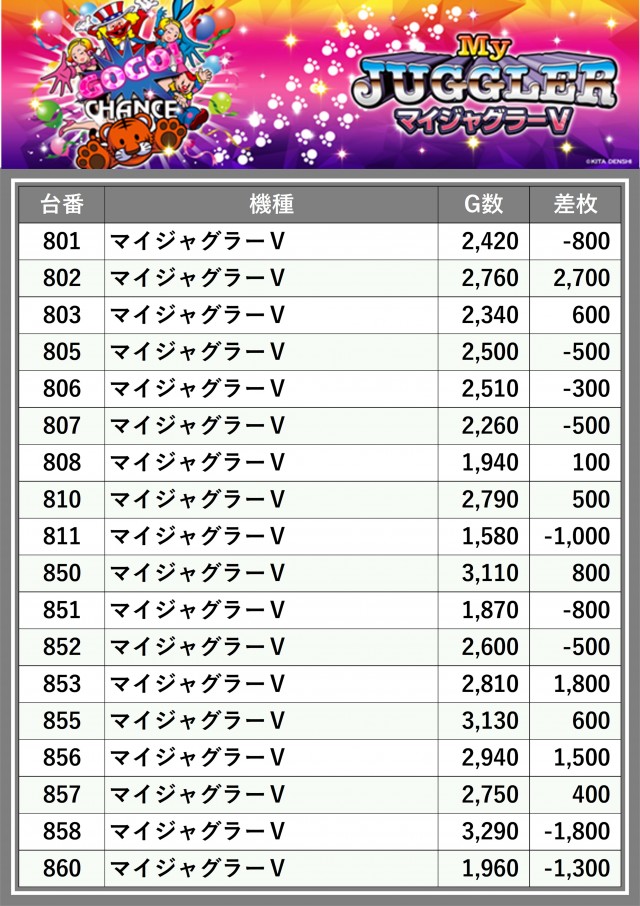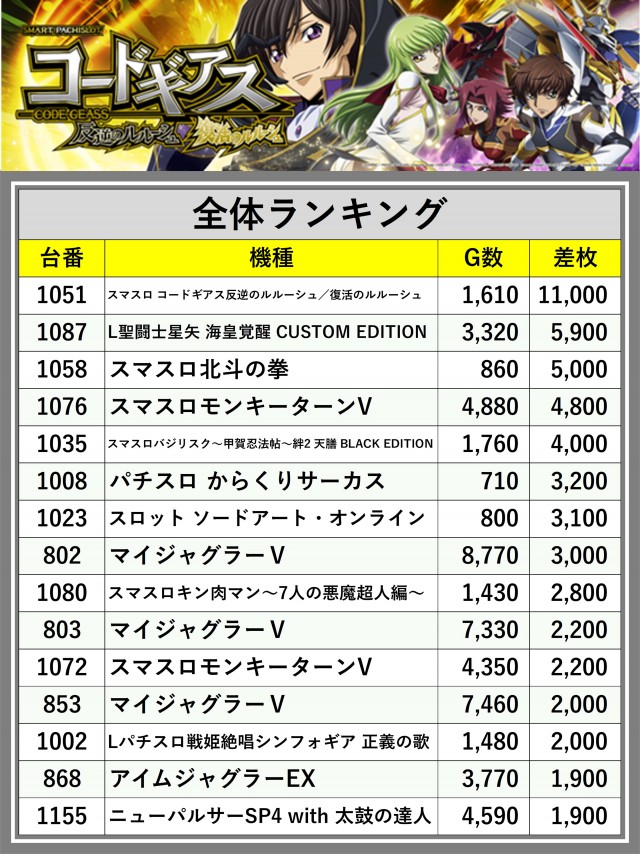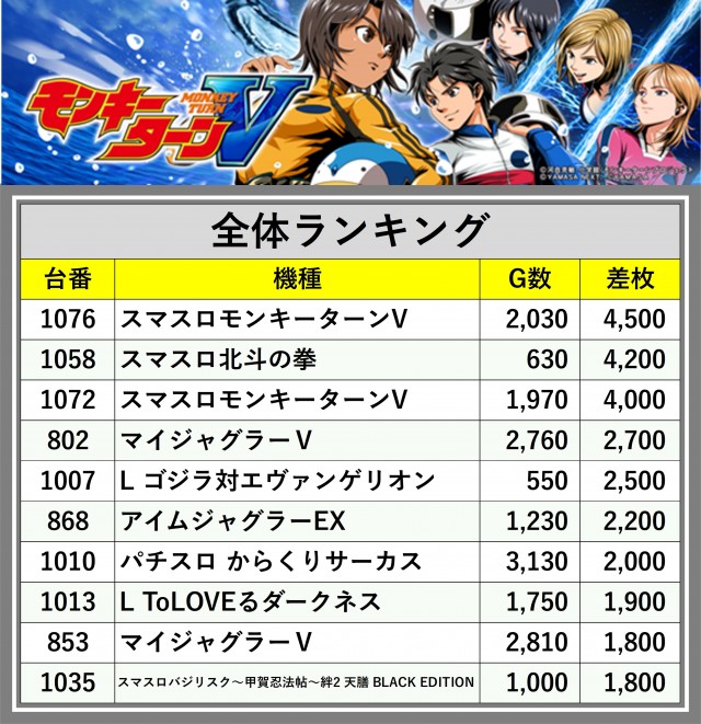 厳選された取材対象機種をはじめ、その他スロット全体から好記録が飛び出した!プレイヤーが楽しんだ1日を下記データにて振り返ってみて欲しい。