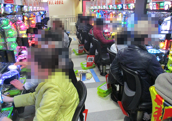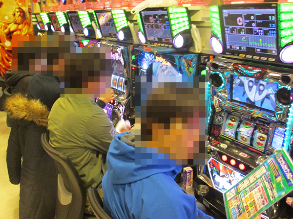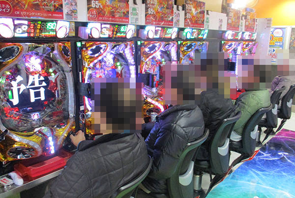 朝イチのホール内では、パチスロが多くのプレイヤーでにぎわっていた。