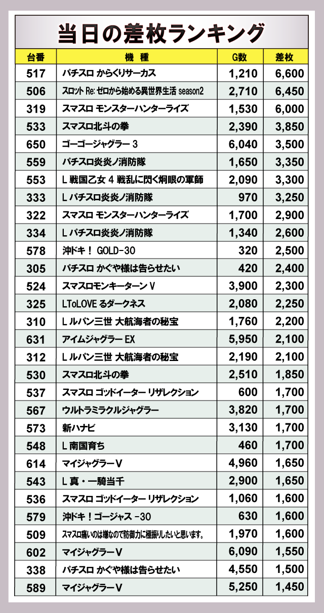 ※差枚数順に掲載しています。