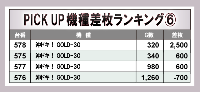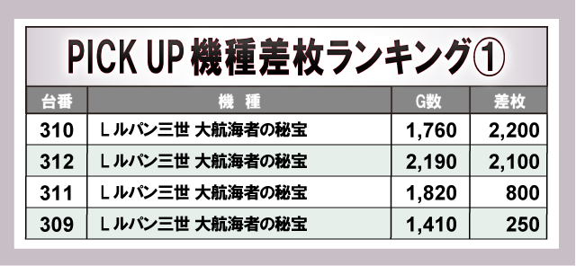 上表の7機種から4桁プラス台が多数発生し、ファンは自信をもってレバーを叩いていた様子が目に浮かぶ。また新台『Lルパン三世 大航海者の秘宝』や『沖ドキ!ゴージャス-30』も名を連ねており、今後の活躍が期待されるばかりだ。
