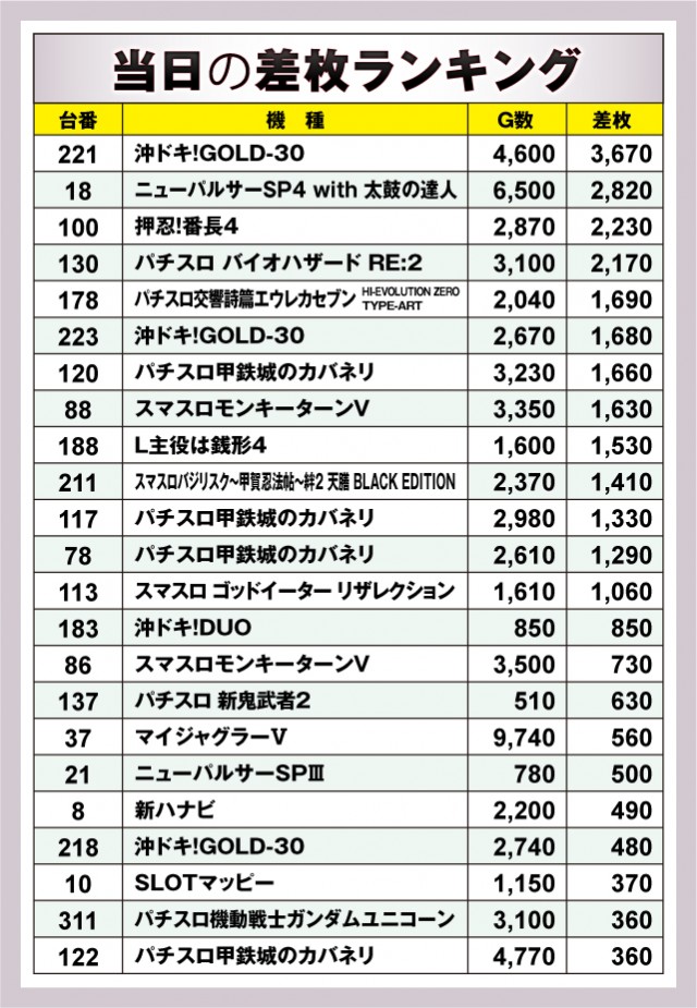 今回のランキングはコチラ。トップ差枚数となるのは『沖ドキGOLD-30』。221番台から3,670枚の出玉獲得となった。