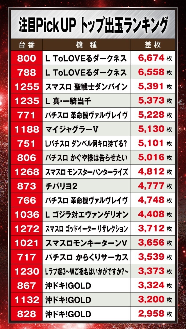 また、その他の機種も負けてはおらず『スマスロ 聖戦士ダンバイン』や『L 真・一騎当千』、『パチスロ 革命機ヴァルヴレイヴ』に『マイジャグラーⅤ』など、新旧やタイプを問わず、ありとあらゆる機種が+5,000枚超を記録していた。