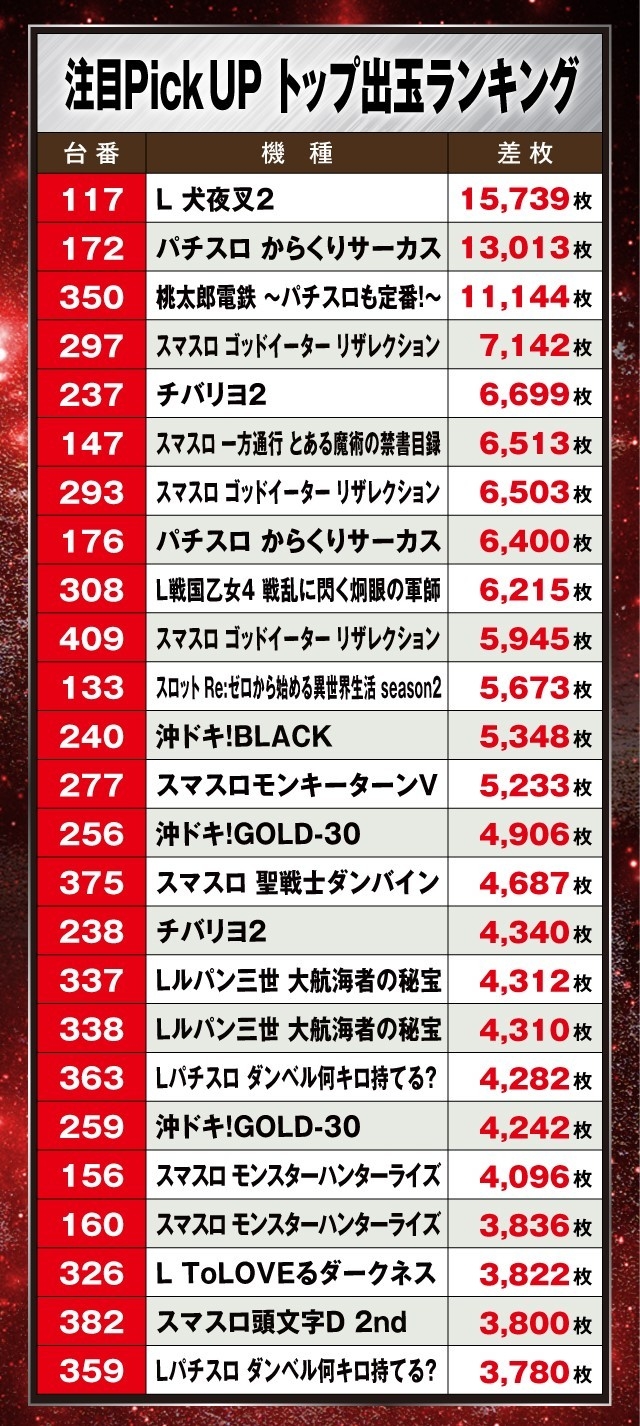 また、その他の機種では『スマスロ ゴッドイーター リザレクション』の+7,142枚をはじめ、『チバリヨ2』や『スマスロ 一方通行 とある魔術の禁書目録』、『L戦国乙女4 戦乱に閃く炯眼の軍師』など、様々な機種で+6,000枚超を確認できた。