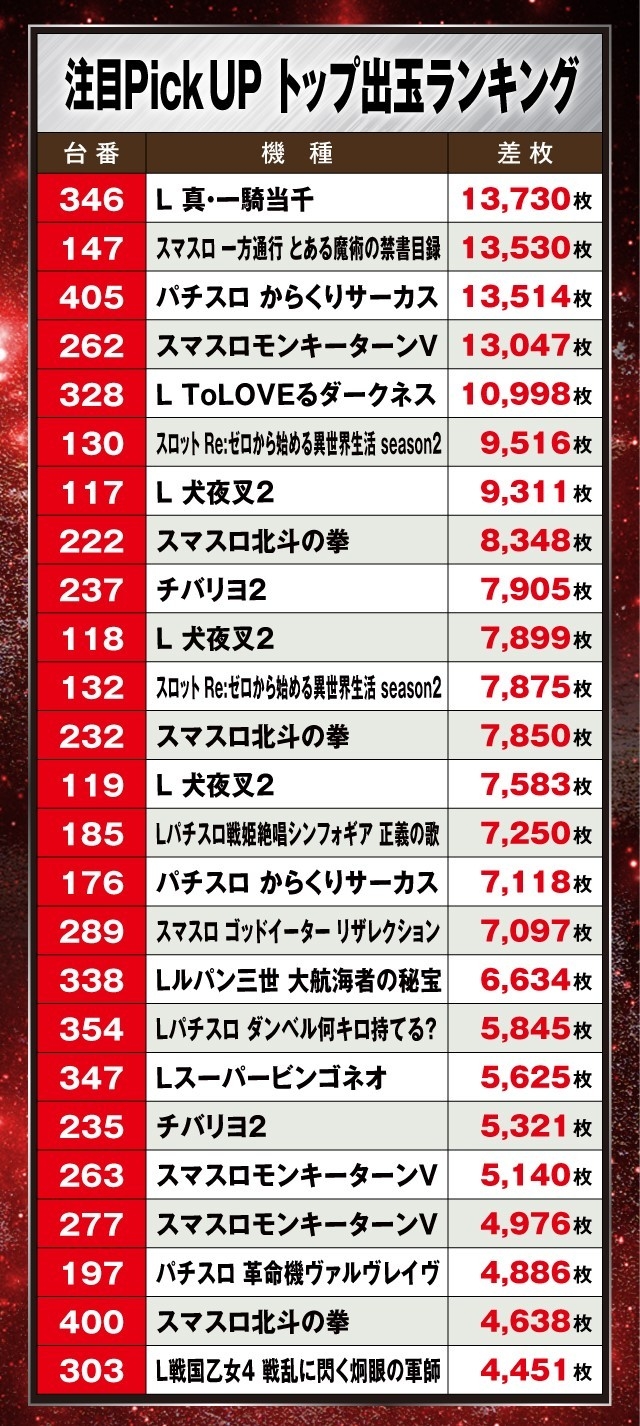 また、その他の機種で目立っていたのが『スロット Re:ゼロから始める異世界生活 season2』と『L 犬夜叉2』で、どちらからも+9,000枚超に+7,000枚超が出現しているだけに、ファンにとっては充実した一日になったはずだ。
